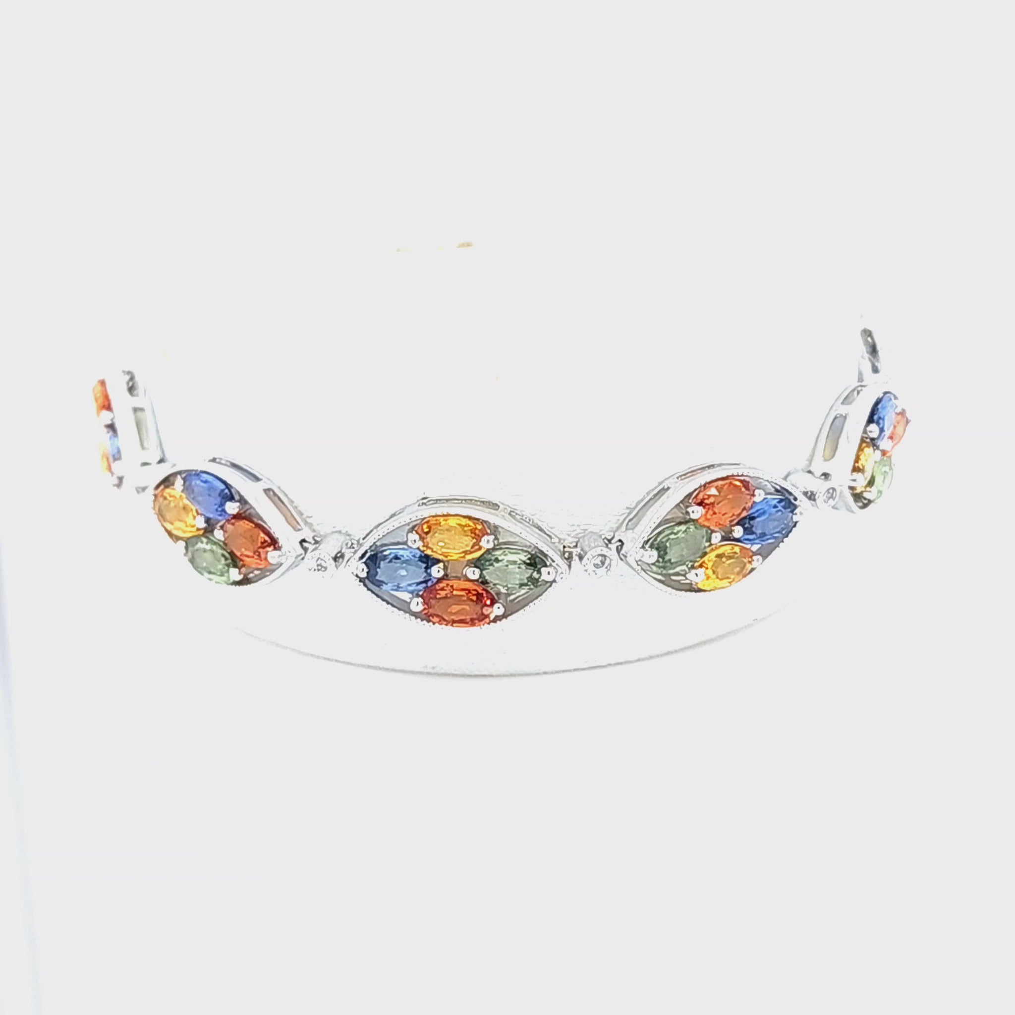 14K Multi Colored Marquise Sapphire & Diamond Bracelet. Bracelet features 7.75ct Total Weight of multicolored genuine Sapphires and .05ct Total Weight of accent natural Diamonds.